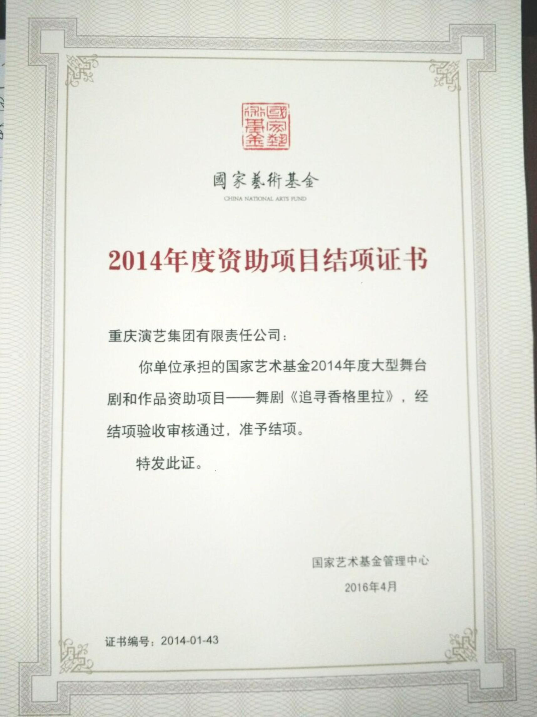 2014年芭蕾舞剧《追寻香格里拉》荣获国家艺术基金舞台创作项目。